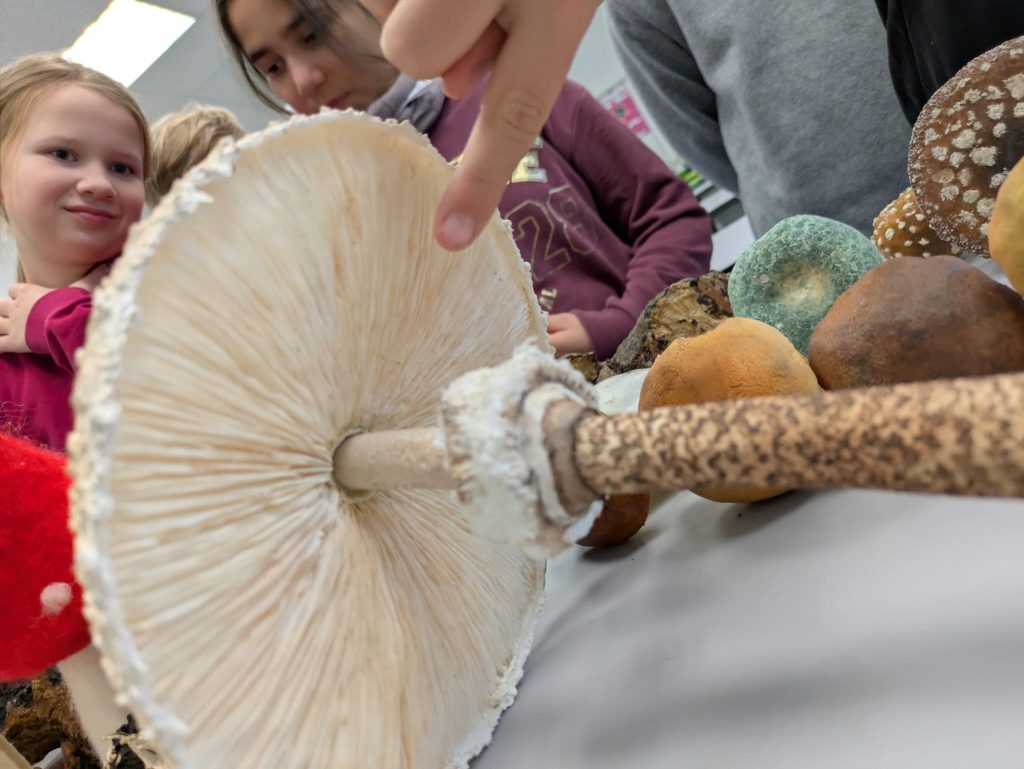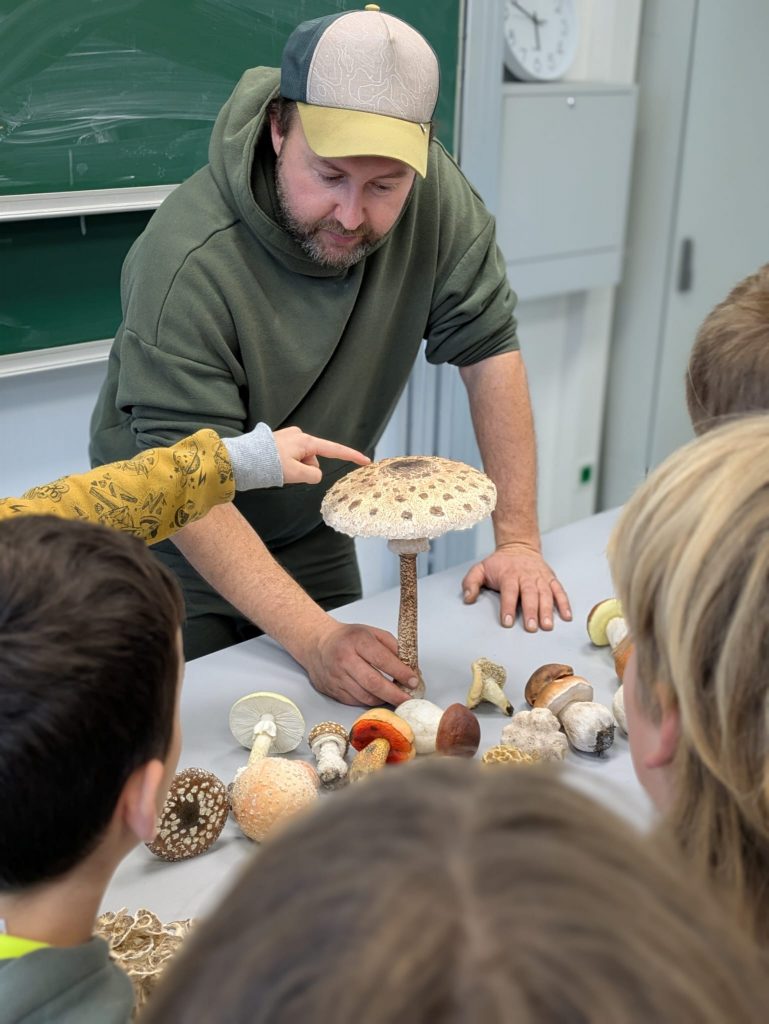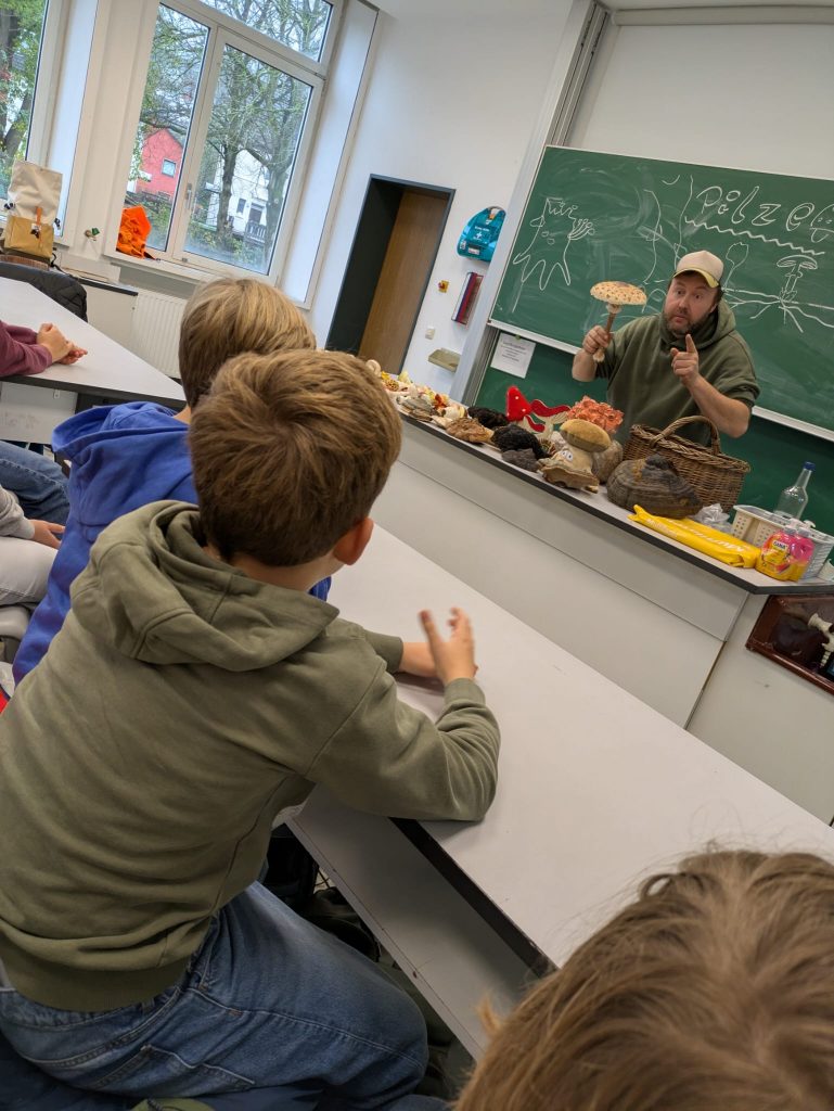 Dass es neben Pflanzen und Tieren einen weiteren spannenden Bereich in der Biologie gibt, konnten alle fünften Klassen ganz hautnah erleben. Neben echtem Anschauungsmaterial wie dem Birkenporling, lagen auch verblüffend echte Nachbildungen in seinem Körbchen. Den grünen Knollenblätterpilz lassen wir lieber links liegen, für die Gesundheit, gerade in der kalten Jahreszeit, sind Pilze aber nicht nur in der Pfanne ein Genuss, sondern auch als Tee und für Wunden ein wahres Wundermittel. Pilze statt Pflaster, wir haben nicht schlecht gestaunt.