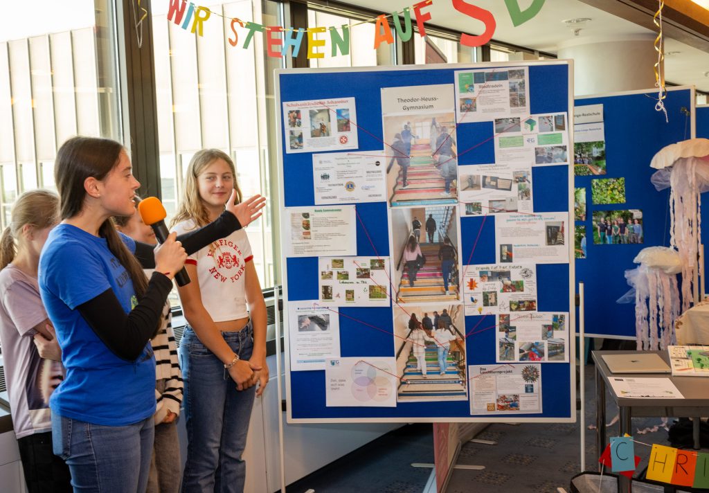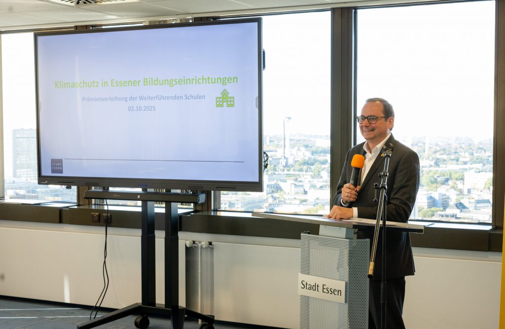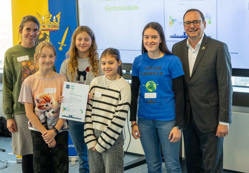 Unsere Schule wurde mit dem Preis im Projekt „Klimaschutz in Bildungseinrichtungen“ ausgezeichnet – ein ganz besonderer Moment für die Schülerinnen der „Friends 4 Fair Future“ AG, die das vielfältige Engagement des THG im Bereich „Bildung für nachhaltige Entwicklung“ (kurz BNE) vorstellten und den Preis vom Oberbürgermeister Thomas Kufen persönlich entgegennehmen durften.